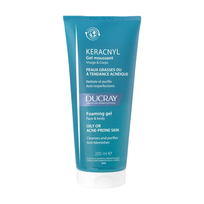• KERACNYL GEL LIMPIADOR ESPUMOSO es un limpiador facial y corporal de uso diario indicado para la piel grasa o con tendencia acneica de adolescentes y adultos.