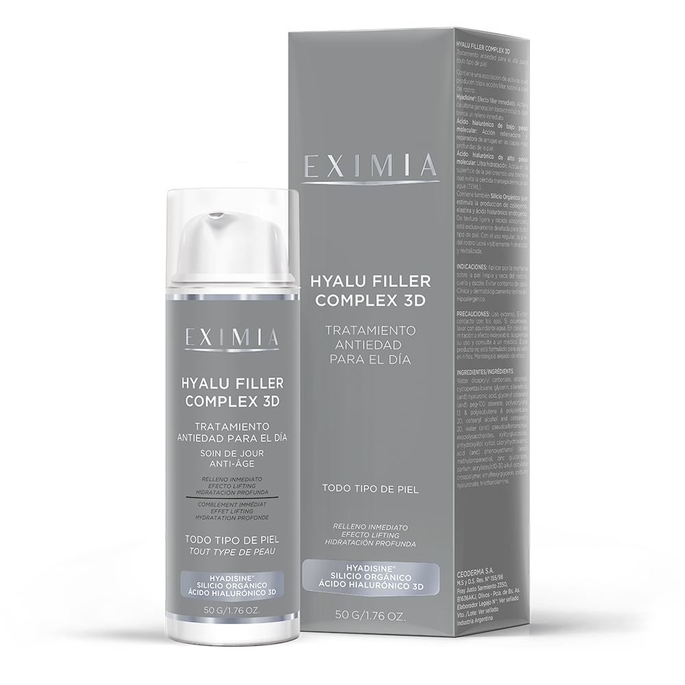 Contiene una asociación de activos que producen triple acción filler sobre la piel del rostro: Hyadisine®: Efecto filler inmediato. Activode última generación biotecnológica que brinda un relleno inmediato. Ácido hialurónico de bajo peso molecular: Acción rellenadora y reparadora de arrugas en las capas más profundas de la piel. Ácido hialurónico de alto peso molecular: Ultra hidratación. Actúa en la superficie de la piel creando una barrera que evita la pérdida transepidérmica de agua (TEWL). Contiene también Silicio Orgánico que estimula la producción de colágeno, elastina y ácido hialurónico endógeno. De textura ligera y rápida absorción, está exclusivamente diseñada para todo tipo de piel. Con el uso regular, la piel del rostro lucirá visiblemente hidratada y revitalizada.